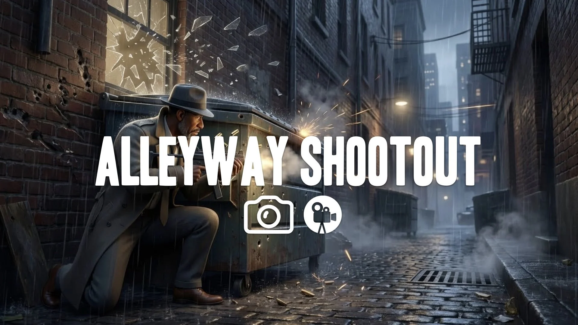 Cover-shooter view. Character crouched behind dumpster in alley, blind-firing SMG. Enemy bullets hit metal. Glass shatters. Keep the character and the original style. No music.
