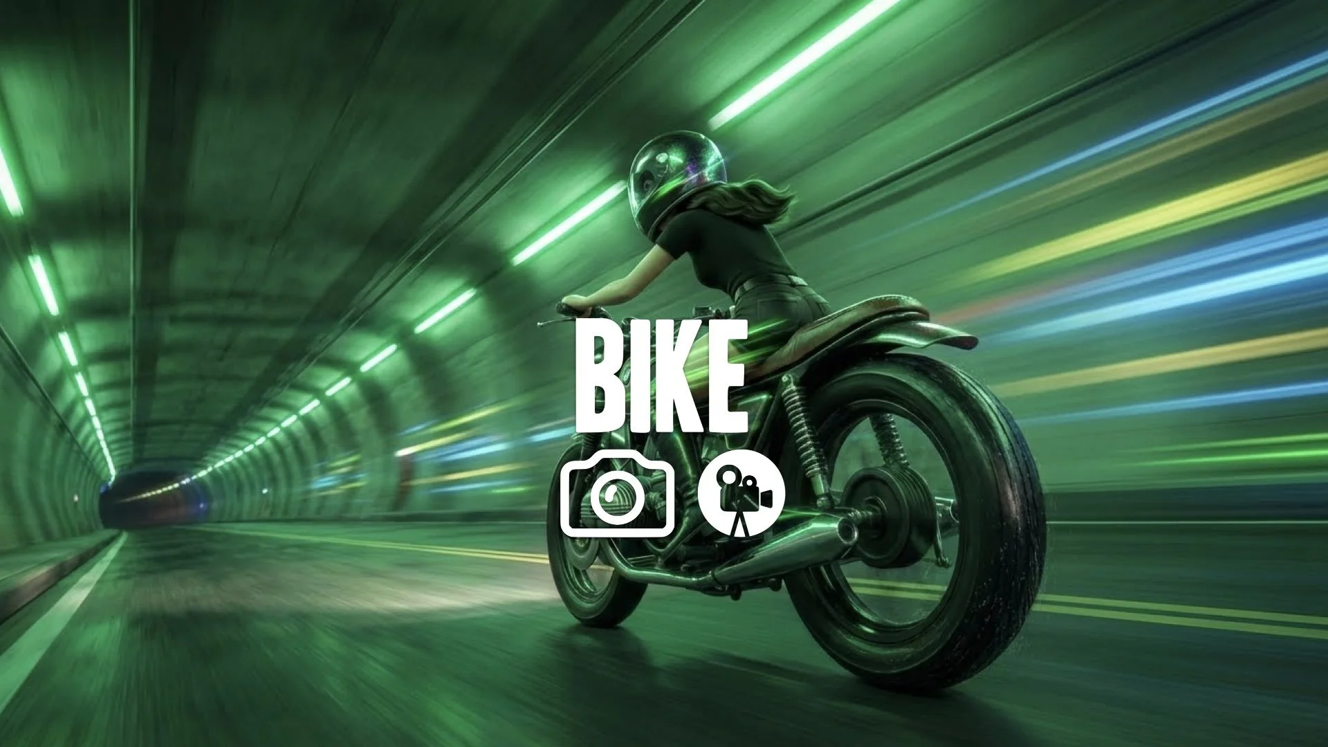 * Motorcycle racing through tunnel green neon light reflection speed blur tire texture no music