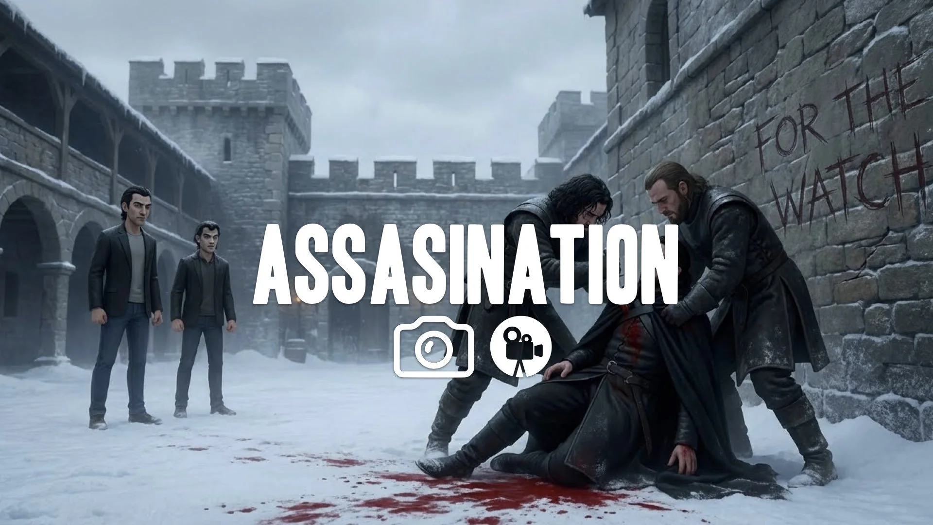 1. Man in black cloak being stabbed repeatedly by brothers in snowy courtyard "for the watch" blood on snow tragic no music