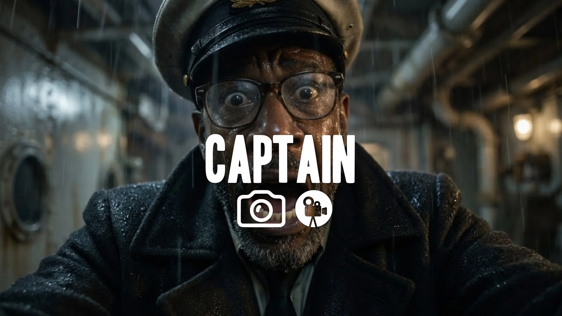Extreme close-up of a captain's horrified, sweating face after a sudden, massive shock hits the boat. Handheld, no music.