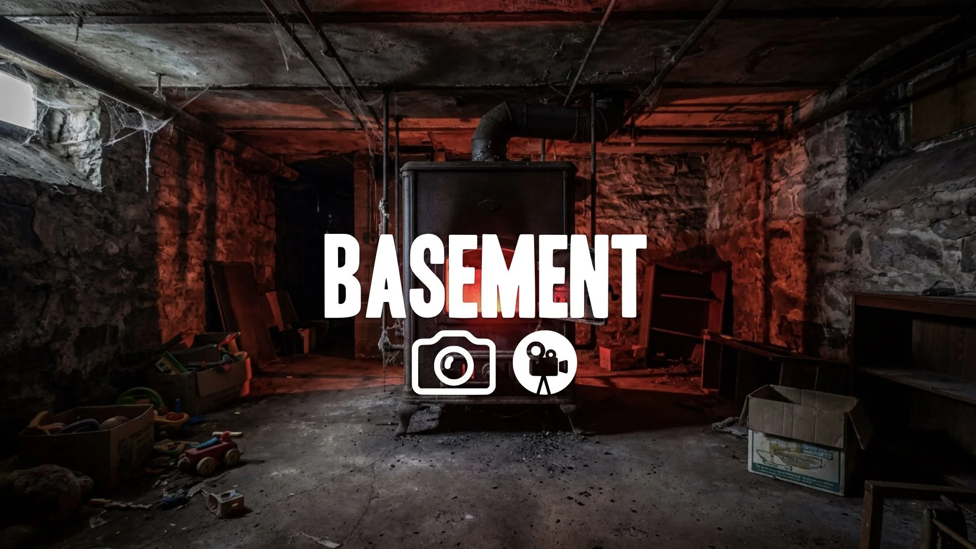 Wide shot of a dark, spooky basement furnace with a red, ominous glow emanating from the mouth of the firebox. Childhood fear, no music.