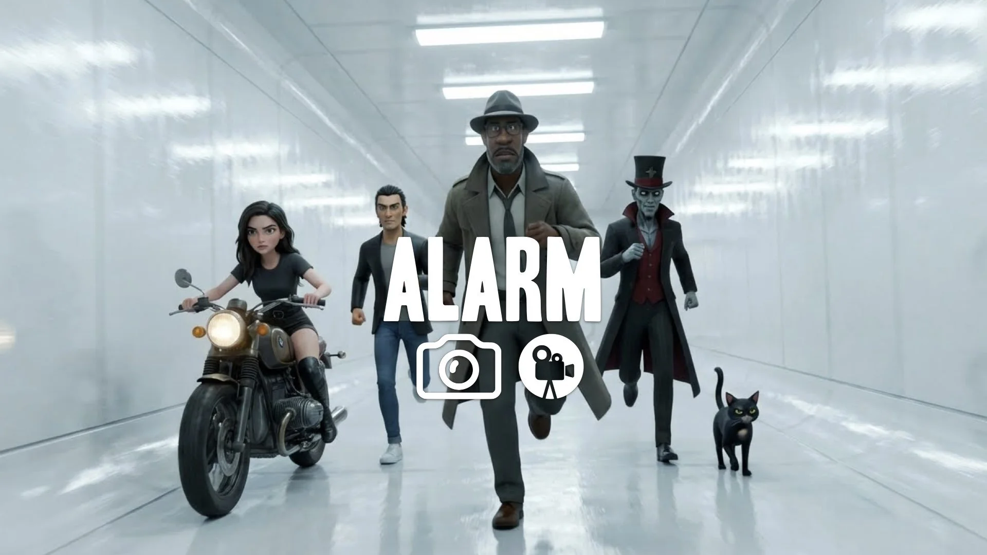Fast-paced tracking shot following a crew member running down a slick, white corridor. Shaky cam, tight focus, no music.