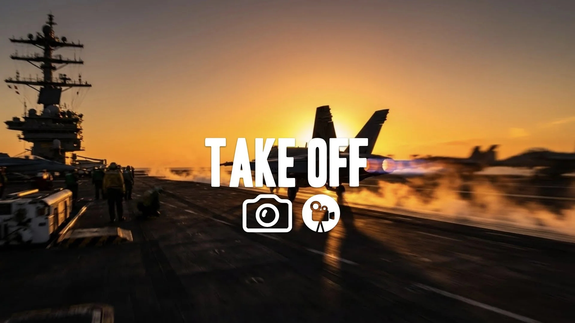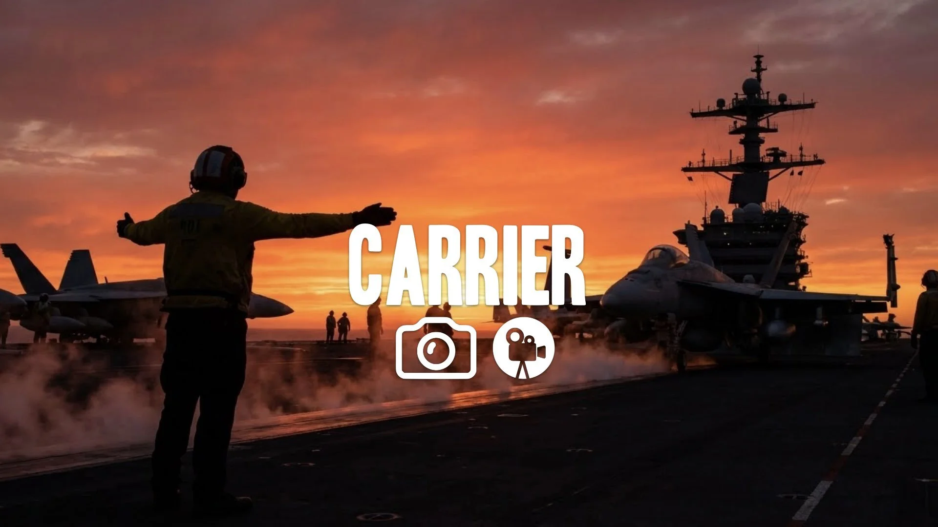 1. Aircraft carrier deck crew signaling steam catapult launch sunset silhouette orange sky heat no music