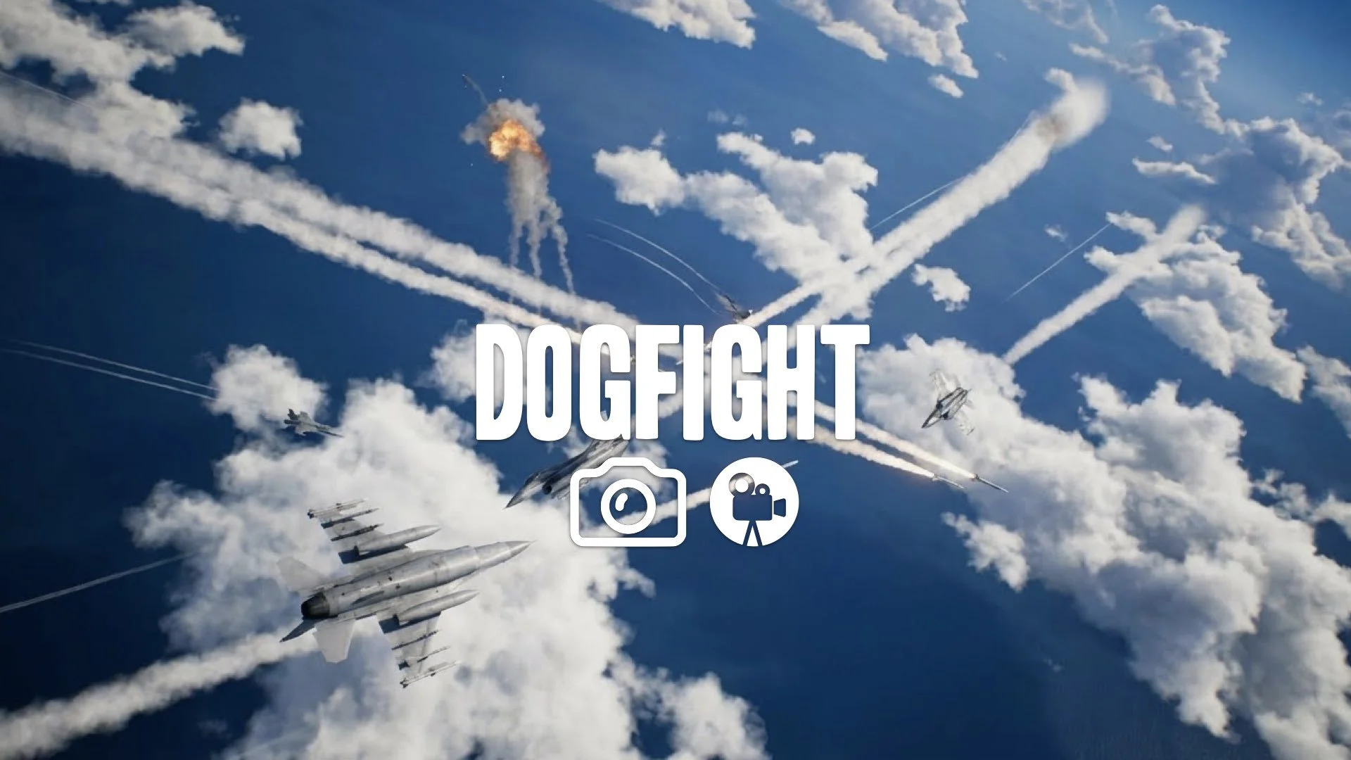 1. Aerial dogfight missiles firing smoke trails blue sky clouds explosion distant no music
