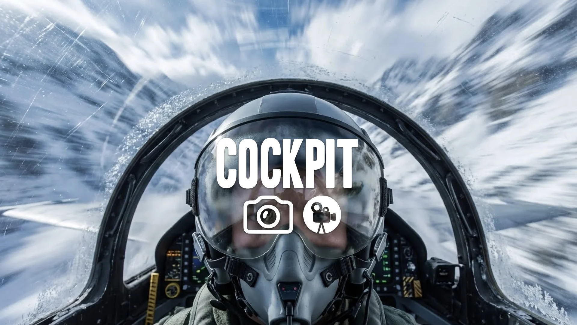1. Pilot cockpit pov breathing heavy helmet reflection snowy mountains fast motion blur no music