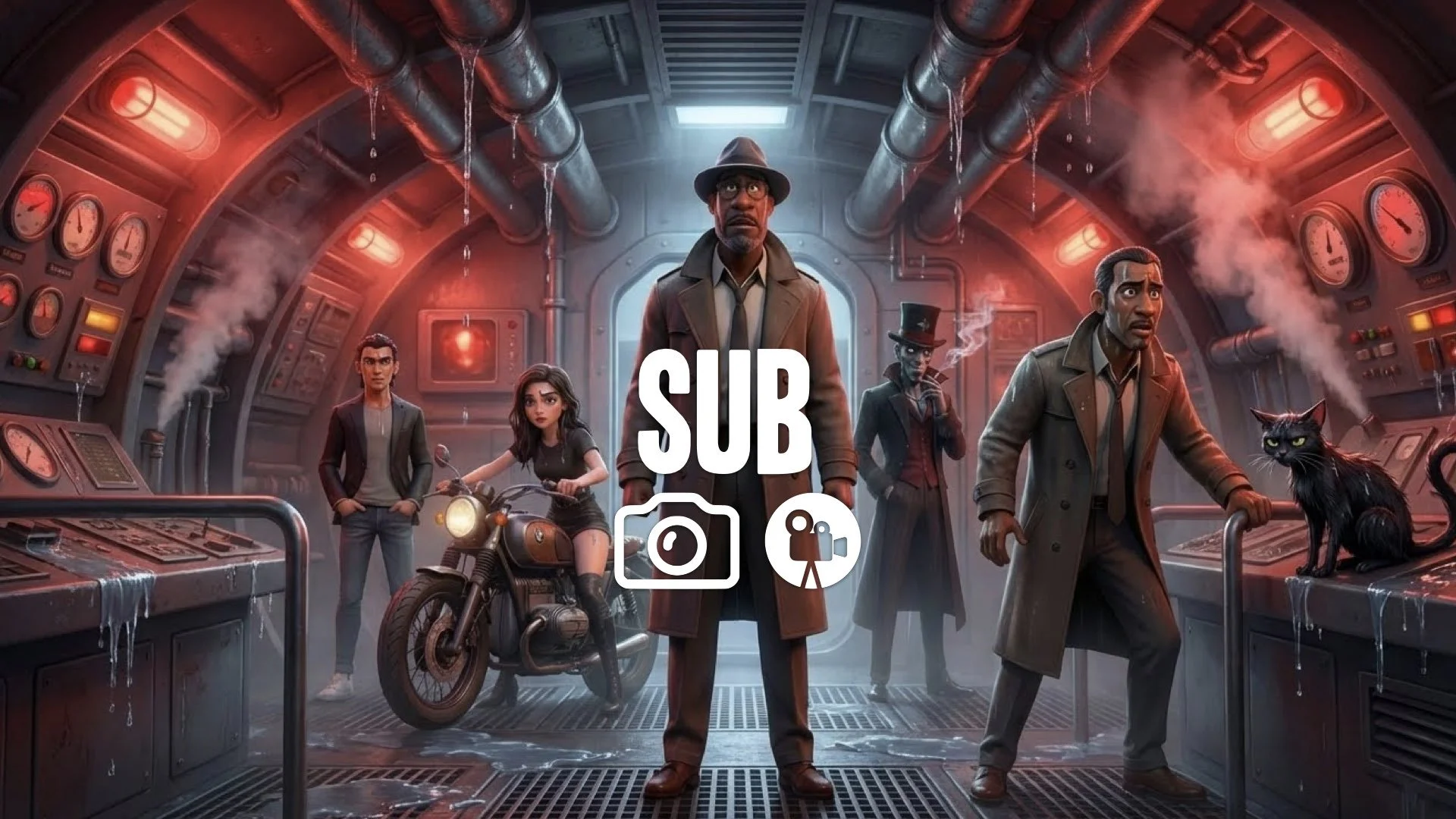 1. Submarine bridge red emergency lighting sweat on faces tension rain inside leak steam no music