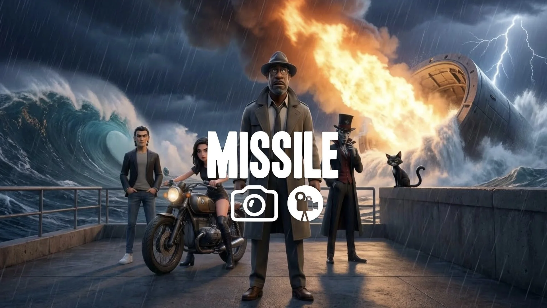 1. Missile launch silo opening water rushing out fire exhaust night storm ocean waves heavy no music