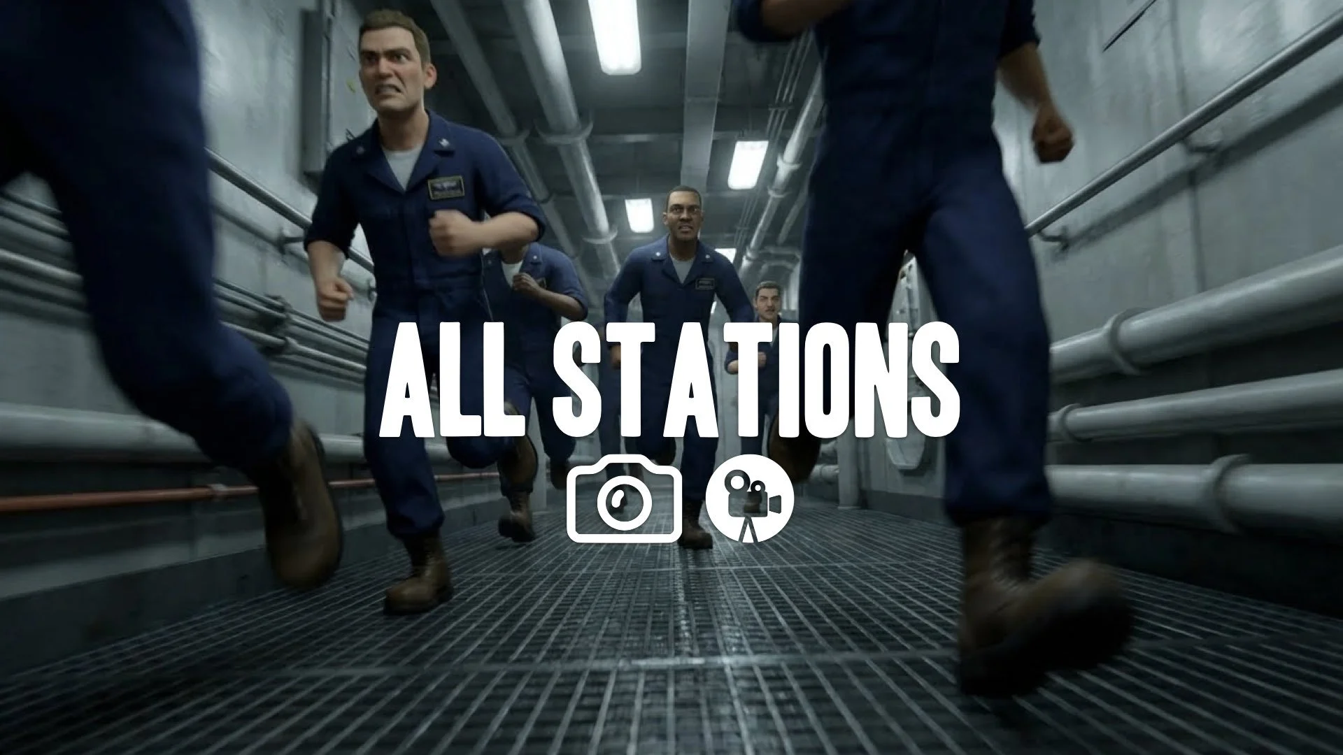 1. Sailors running narrow corridor steel grating boots clanging urgency handheld camera shake no music