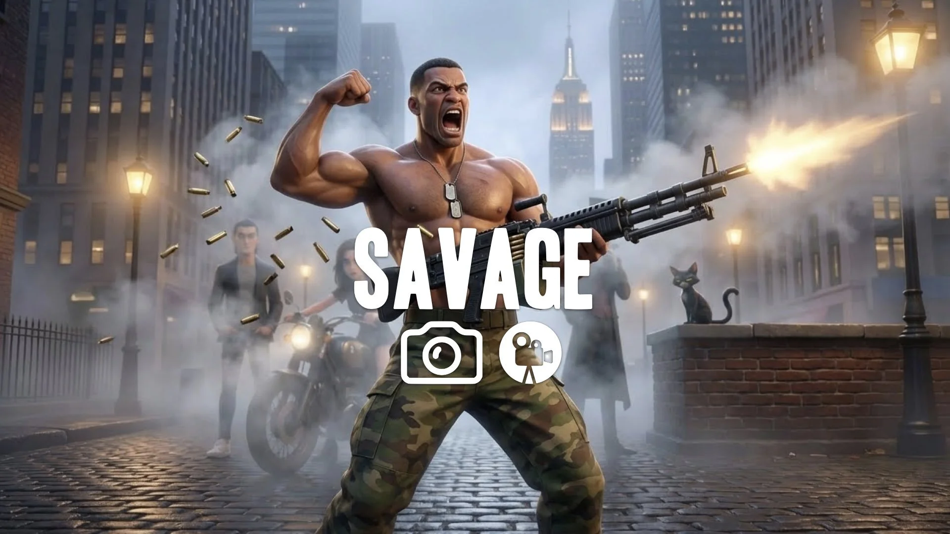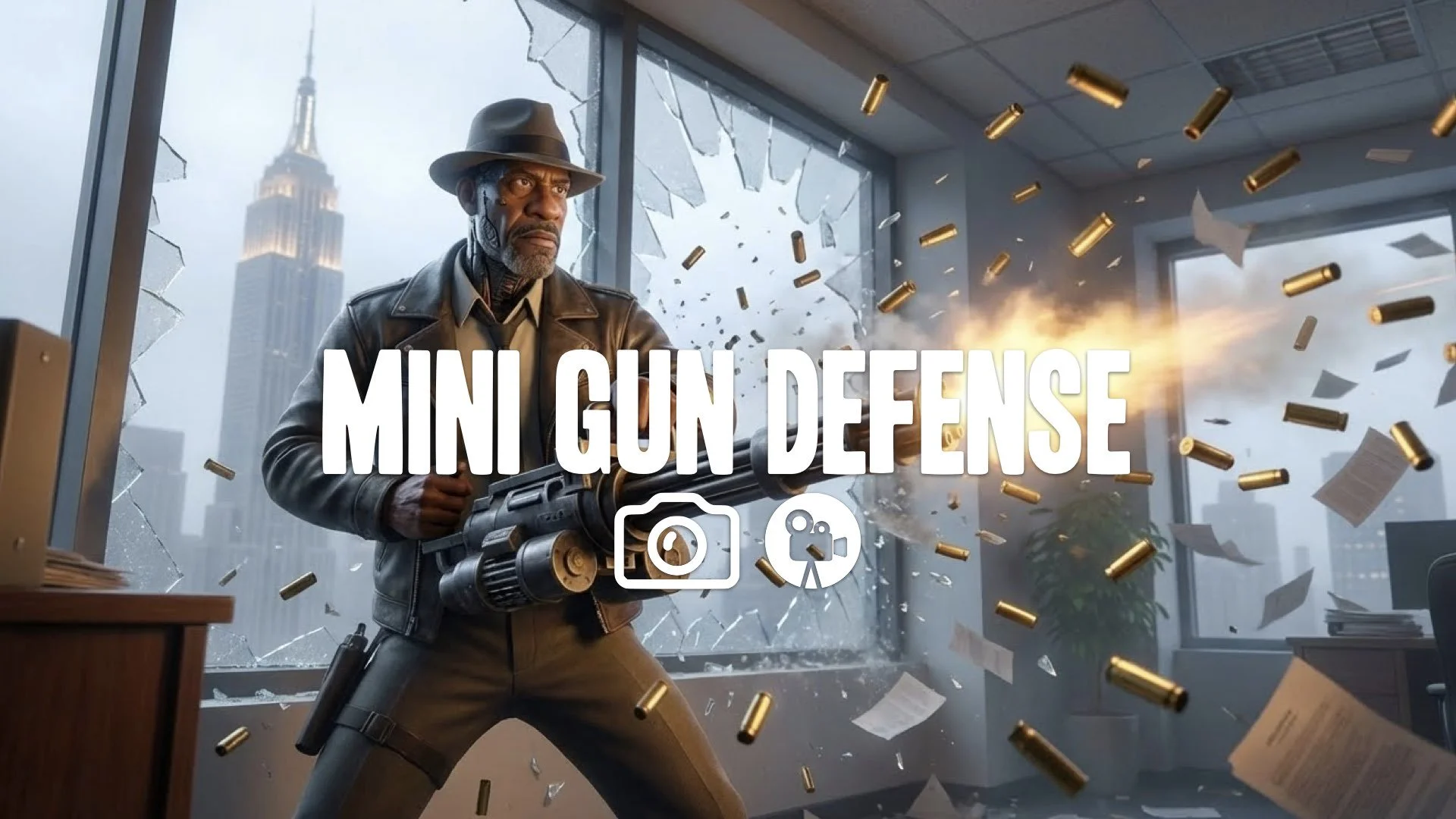 1. Hero in leather jacket firing minigun from office window shattering glass brass casings flying slow motion no music