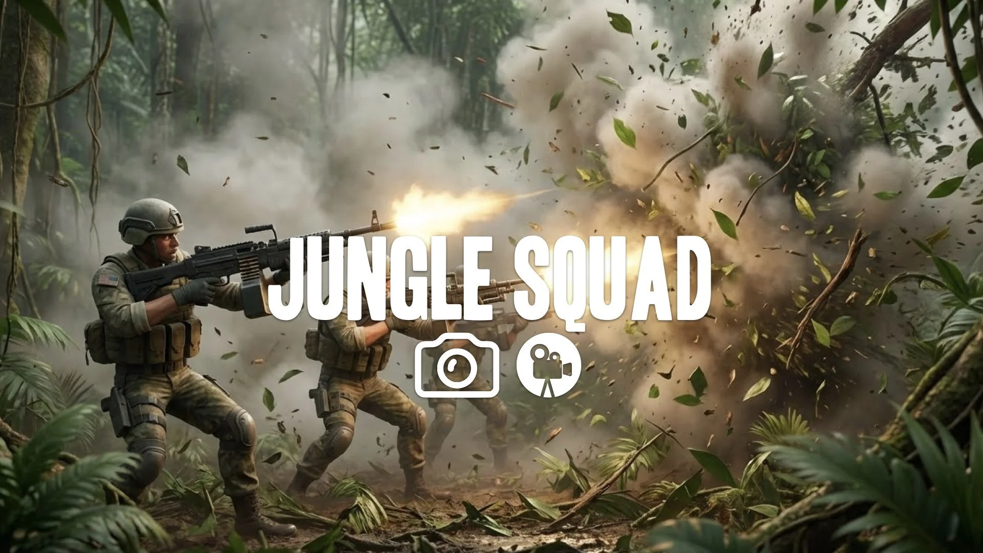 1. Soldiers firing heavy machine guns into dense jungle leaves shredding smoke muzzle flashes chaos no target no music