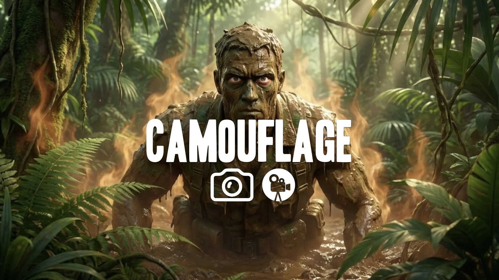 1. Muscular soldier covered in thick mud hiding in jungle foliage eyes opening intense heat haze no music