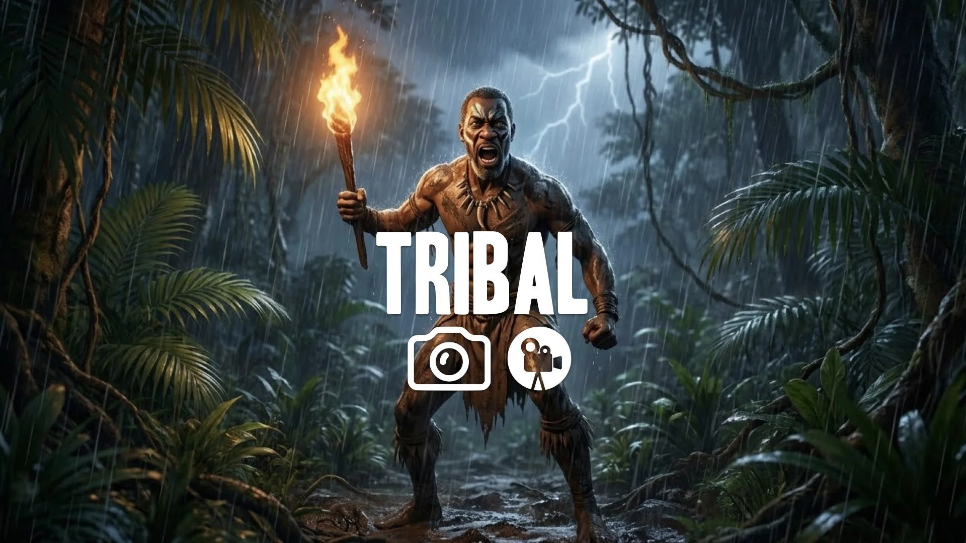 1. Man holding torch yelling in jungle night rain tribal war cry challenging unseen enemy tension no music