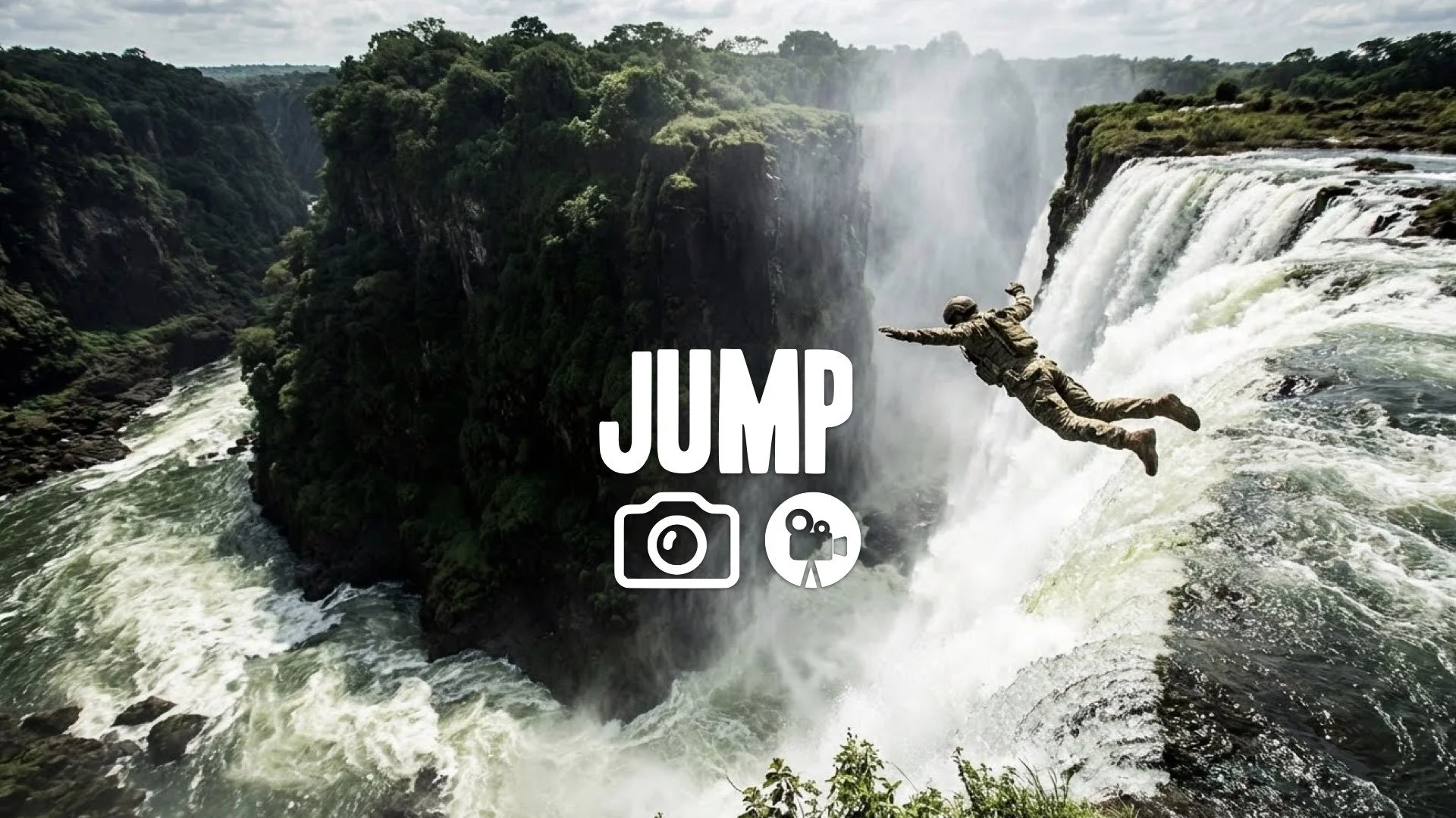 1. Soldier diving off massive waterfall cliff falling into river below survival jump epic scale cinematic no music