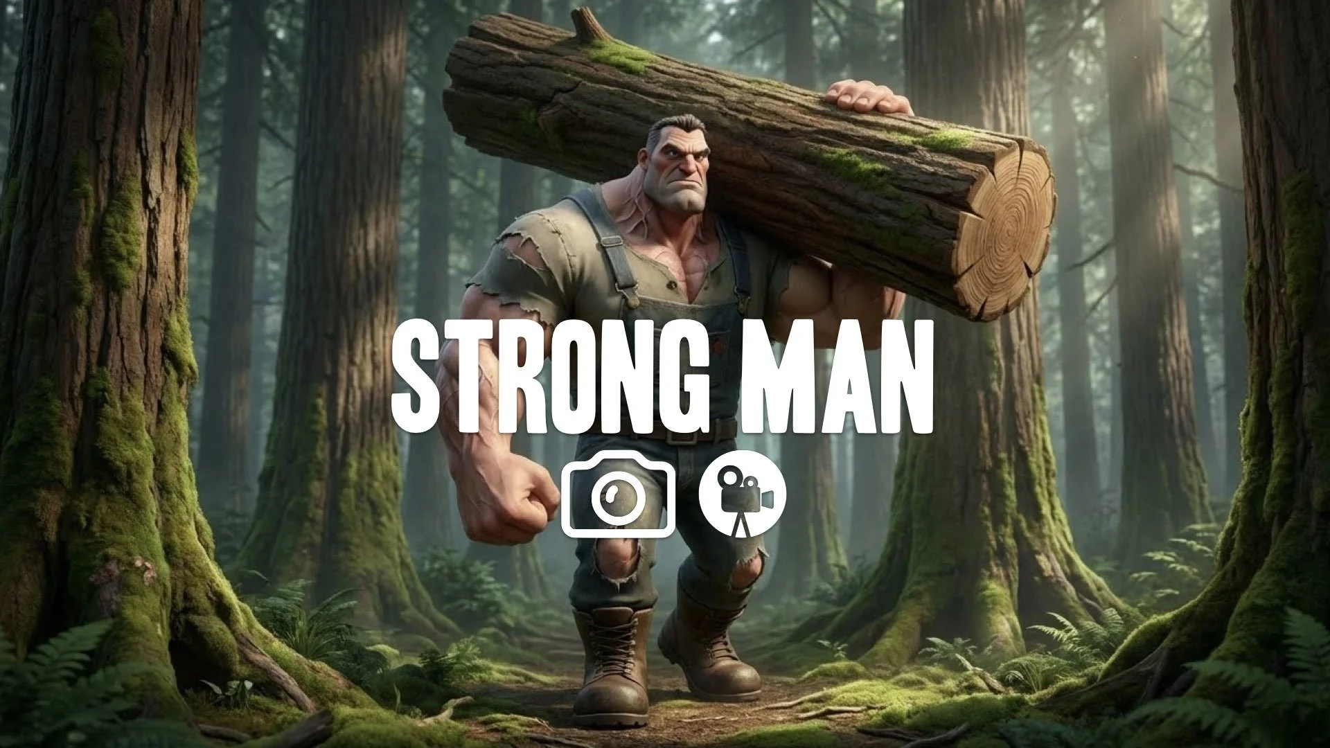 1. Massive muscular man carrying huge tree trunk on shoulder walking through woods flexing veins popping powerful no music