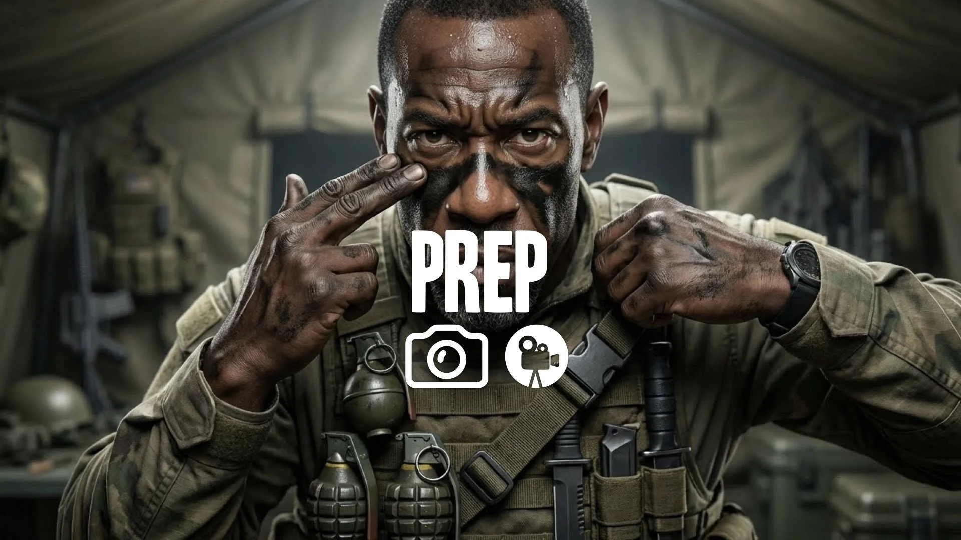1. Soldier strapping on vest grenades knives applying face paint black grease extreme close up preparation tension no music