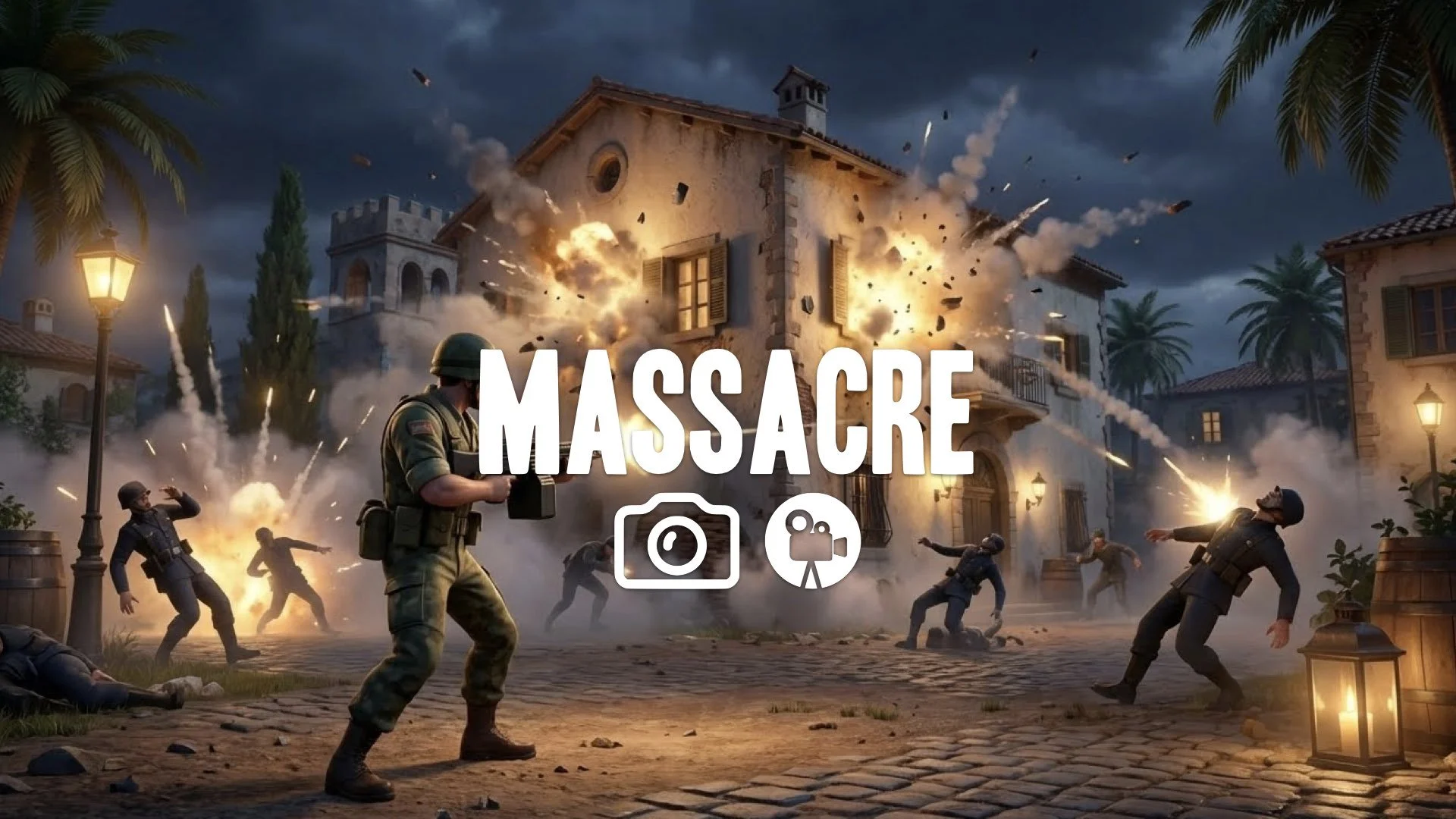 1. Lone soldier storming villa hip firing machine gun explosions everywhere enemies falling chaotic action 80s style no music