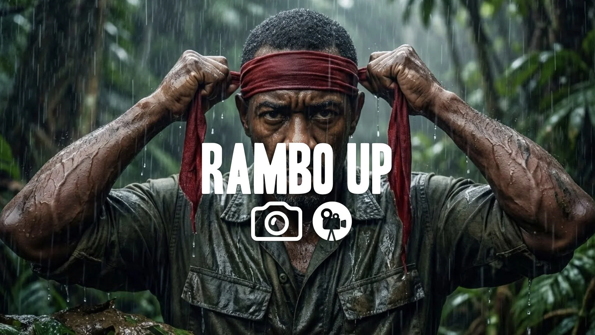 1. Soldier tying red headband tight around forehead rain pouring jungle background intense focus veins no music