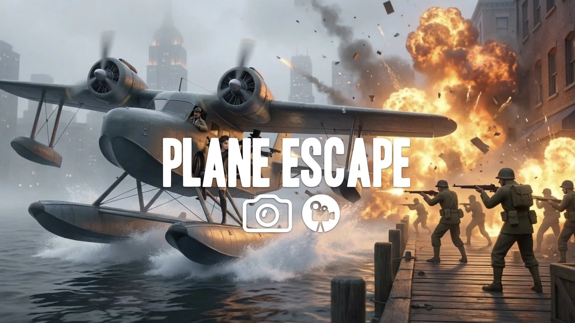 1. Plane taking off from dock fighting soldiers on pier explosion behind water spray action team no music
