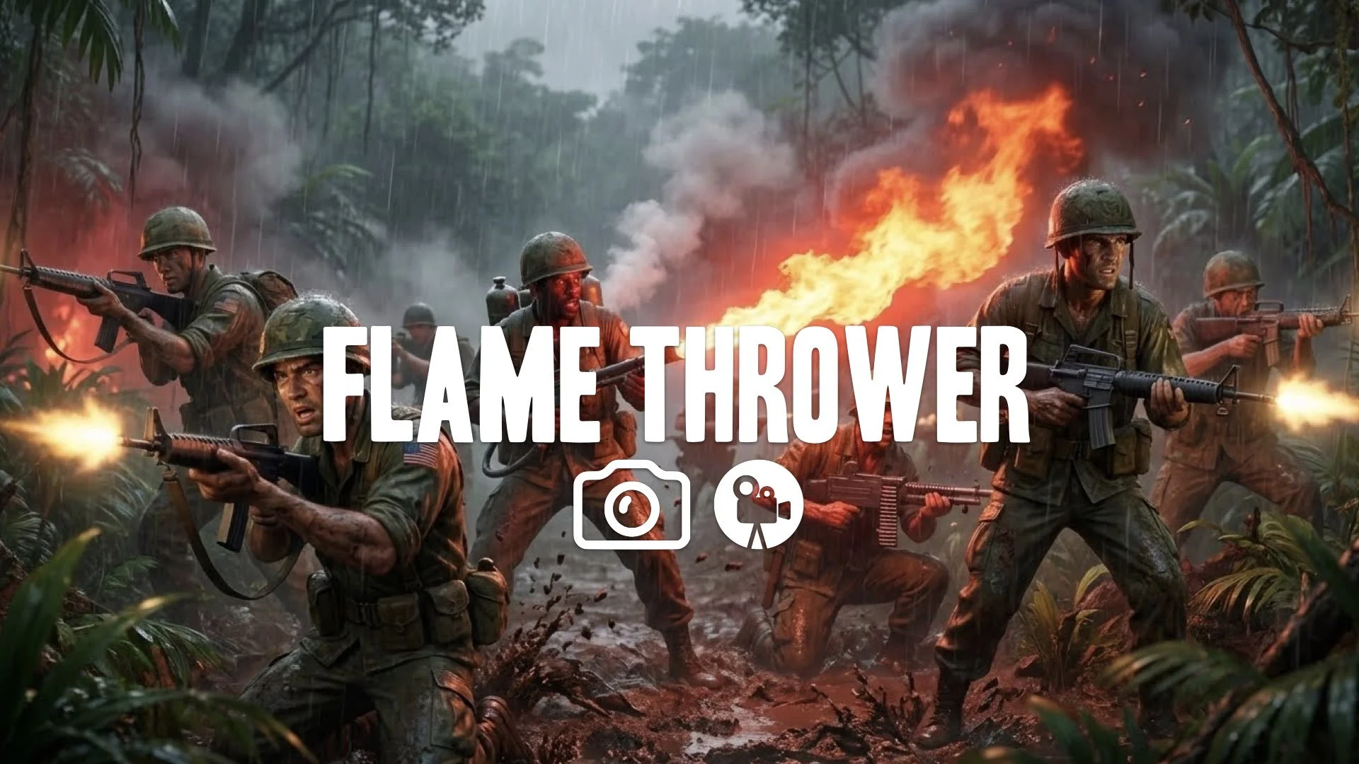 1. Vietnam jungle flashback soldiers shooting rain mud chaotic war scene flamethrower intense heat no music