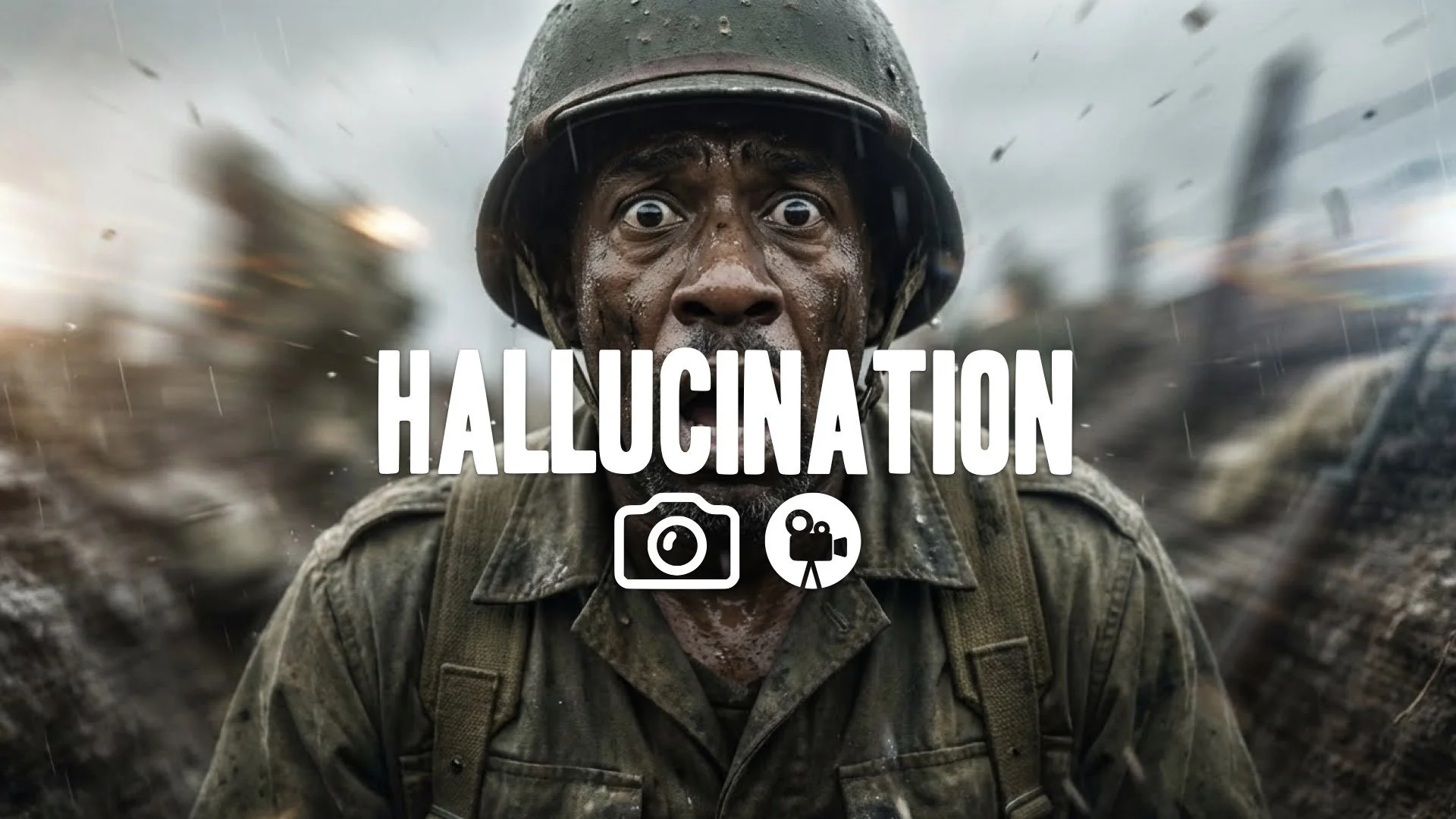 Close-up, desaturated shot of a soldier's exhausted, mud-covered face amidst the battlefield chaos. Gritty realism, no music.