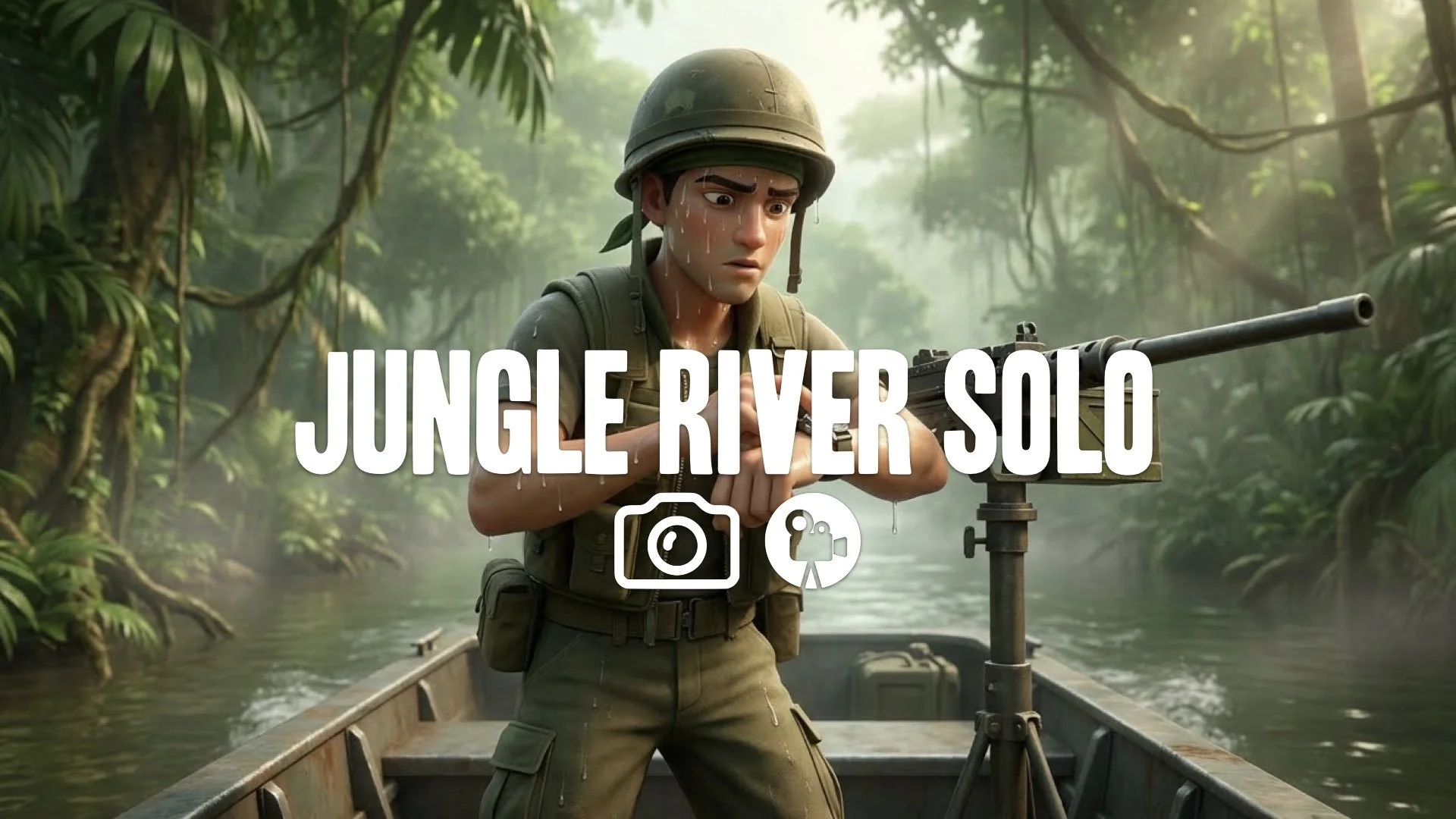 1. Young soldier on patrol boat river jungle heat sweat bandana helmet machine gun watch no music