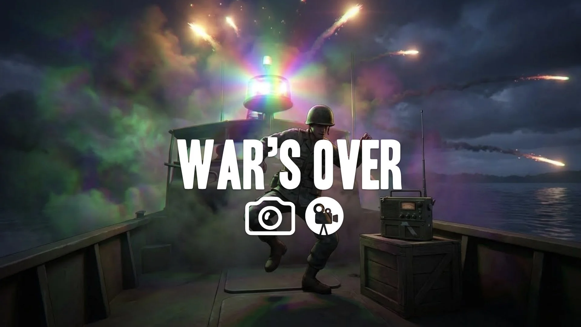 1. Soldier dancing on boat deck radio playing flares firing at night psychedelic war atmosphere no music