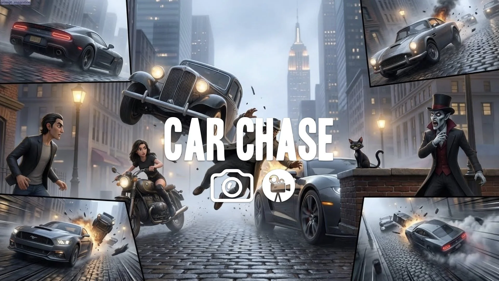 An intense car chase across the landscape of your image, with vehicles flipping and colliding, shot with rapid cuts and dramatic angles. No music