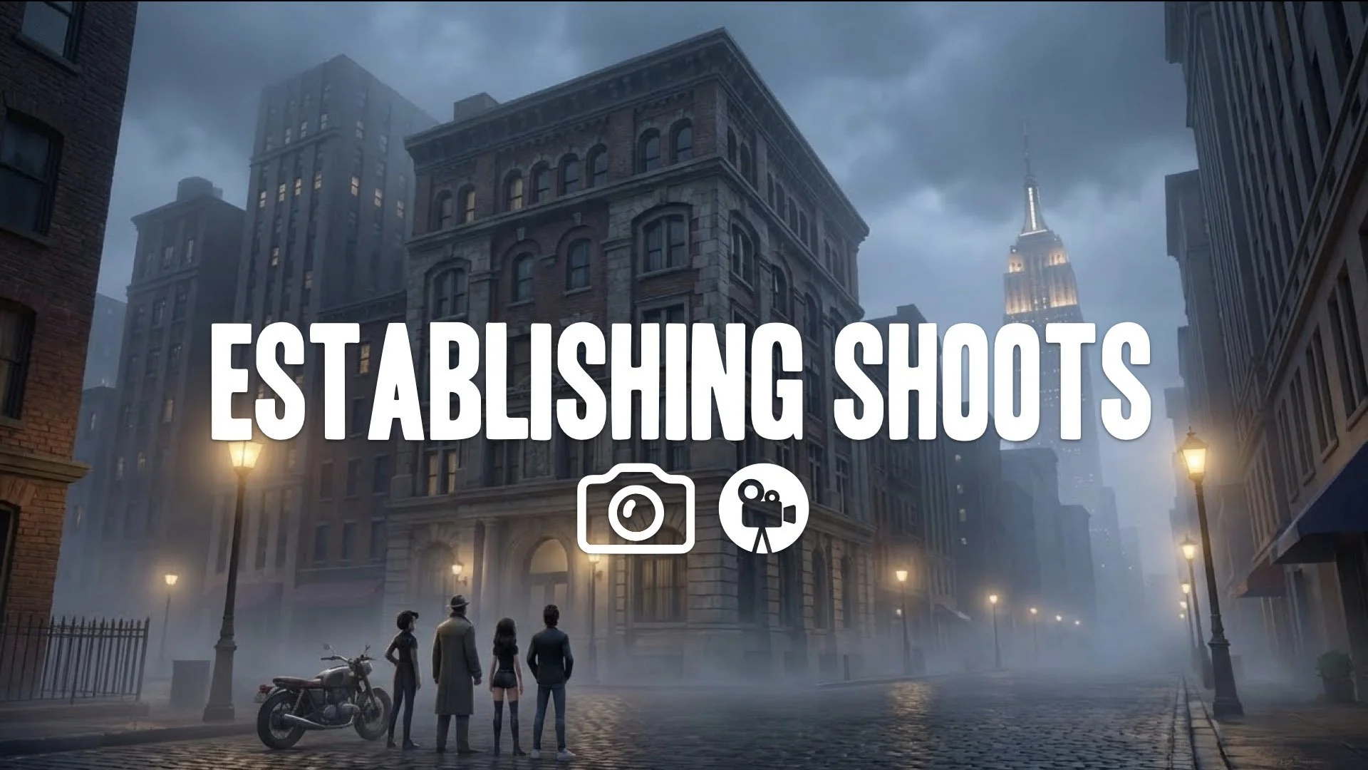 "Exterior view of the building, set in the same tone, style and atmosphere, establishing the setting from afar."